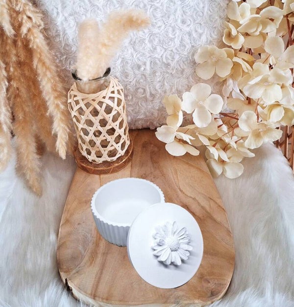 Découvrez l'élégance avec ce pot strillé et son couvercle margurite blanc en résine minérale.
