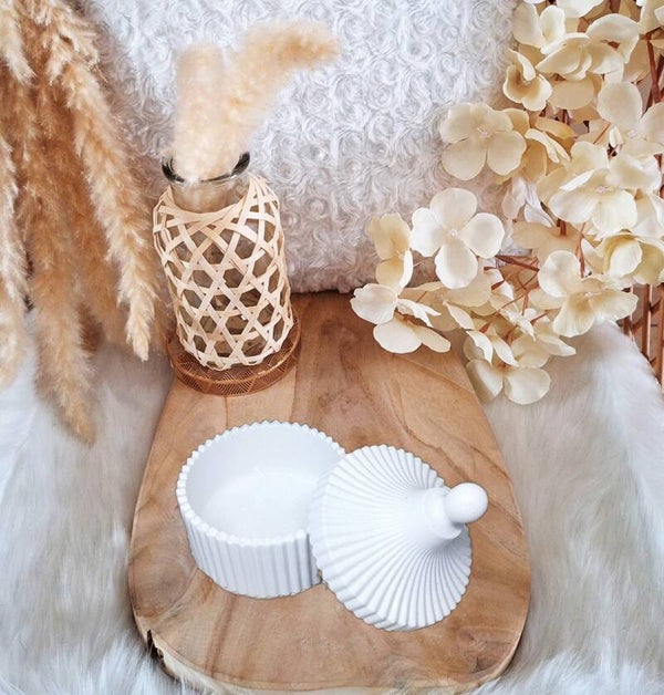 Découvrez l'élégance avec ce pot strillé et son couvercle blanc en résine minérale.