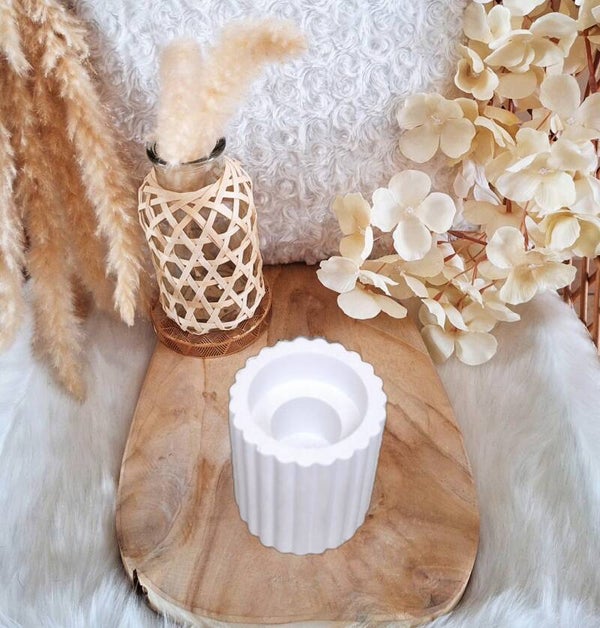 Découvrez l'élégance avec ce pot à allumettes strillé blanc en résine minérale et son grattoir collé au dessous.