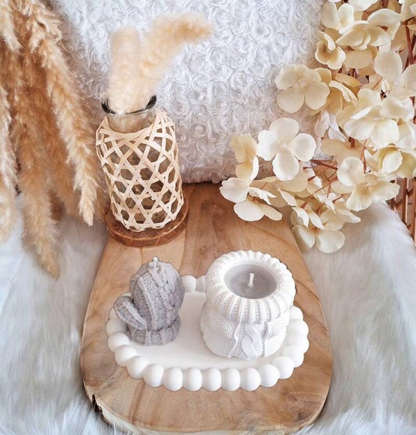 - D'une bougie coulée couleur taupe dans un pot blanc en résine minérale aspect chandail.